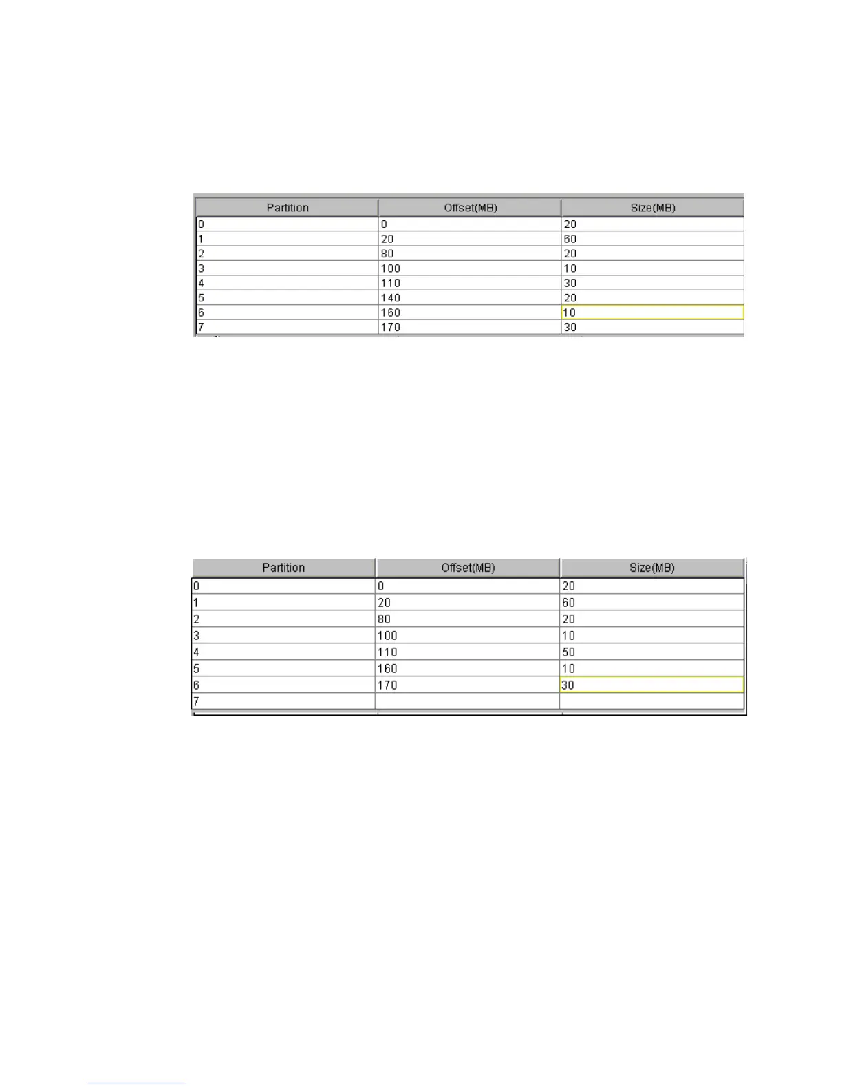 50MB. The size of Partition 5 would then change from 20MB to 10MB (previous size of Partition 6)