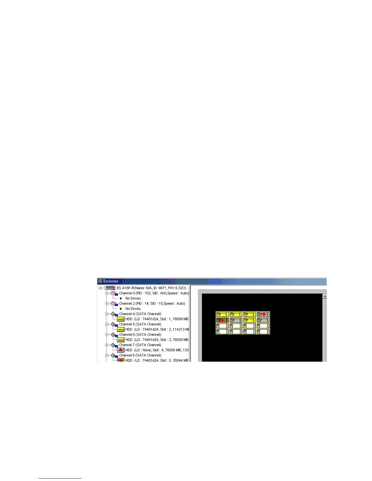 The enclosure window provides real-time reporting of the status of the connected physical drives.