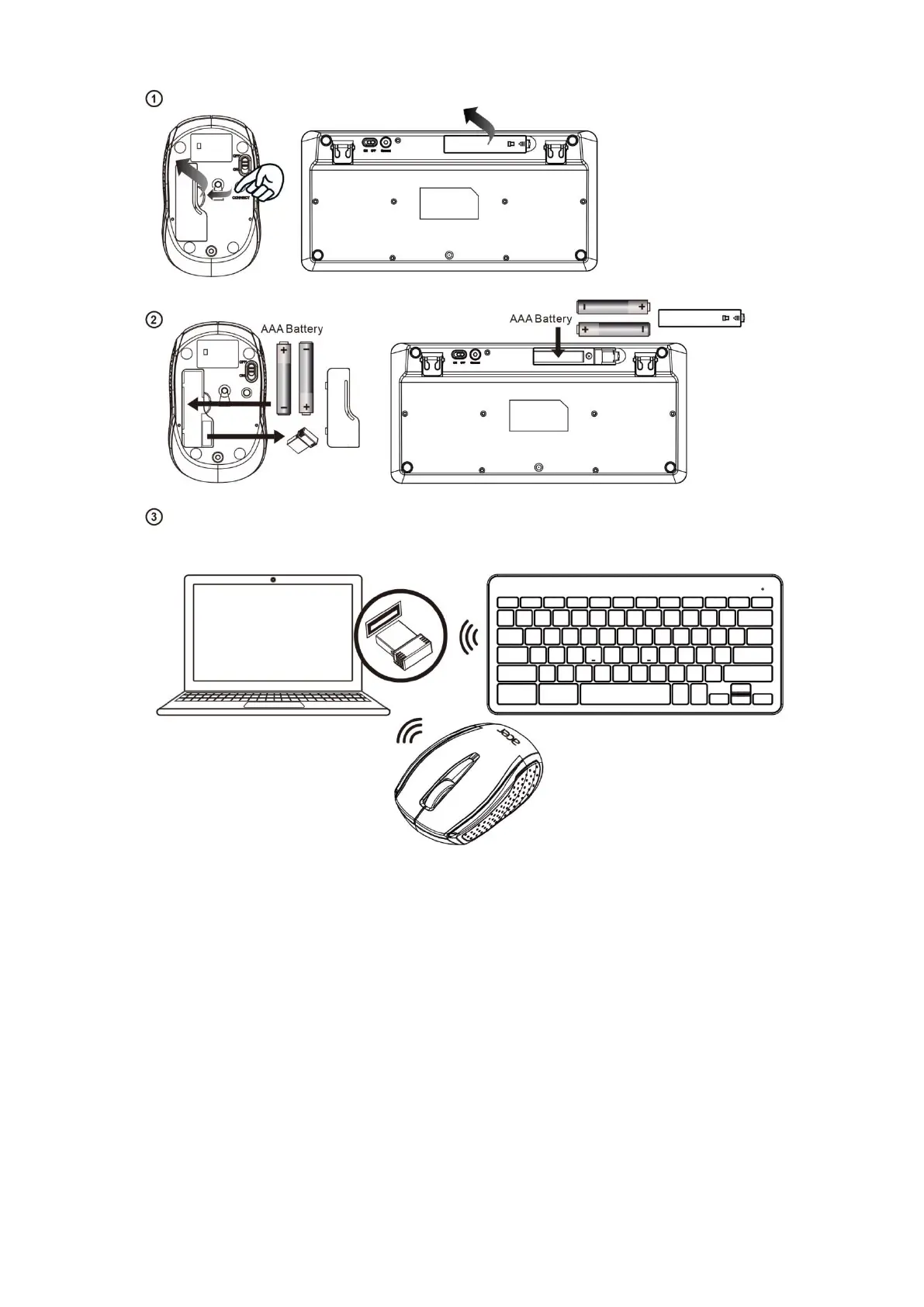 2. Insert the batteries into the mouse and keyboard, then follow the steps below.