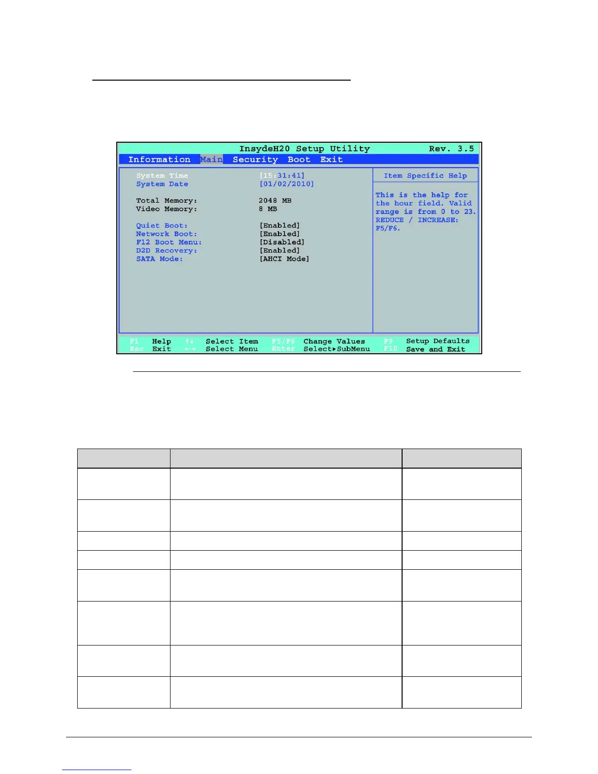 System Time BIOS system time in 24-hour format Format: HH:MM:SS