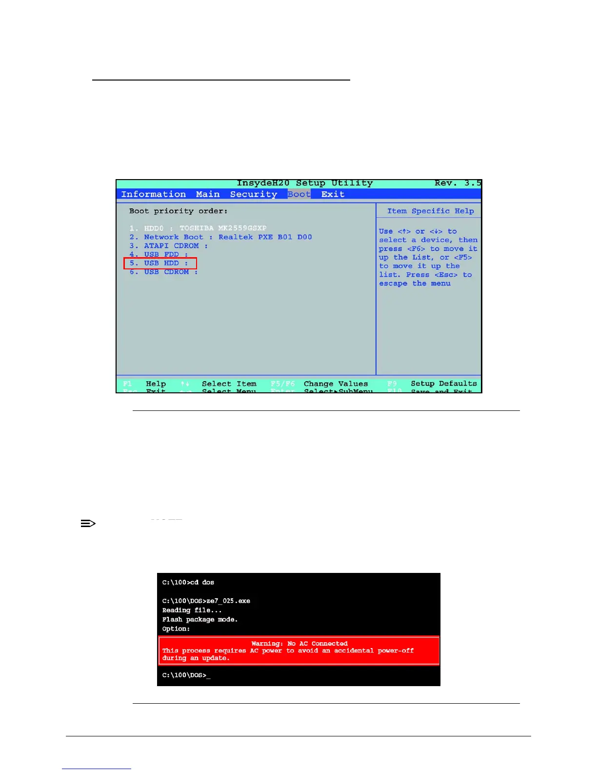 Example: If using USB HDD to Update BIOS, move USB HDD to position 1.