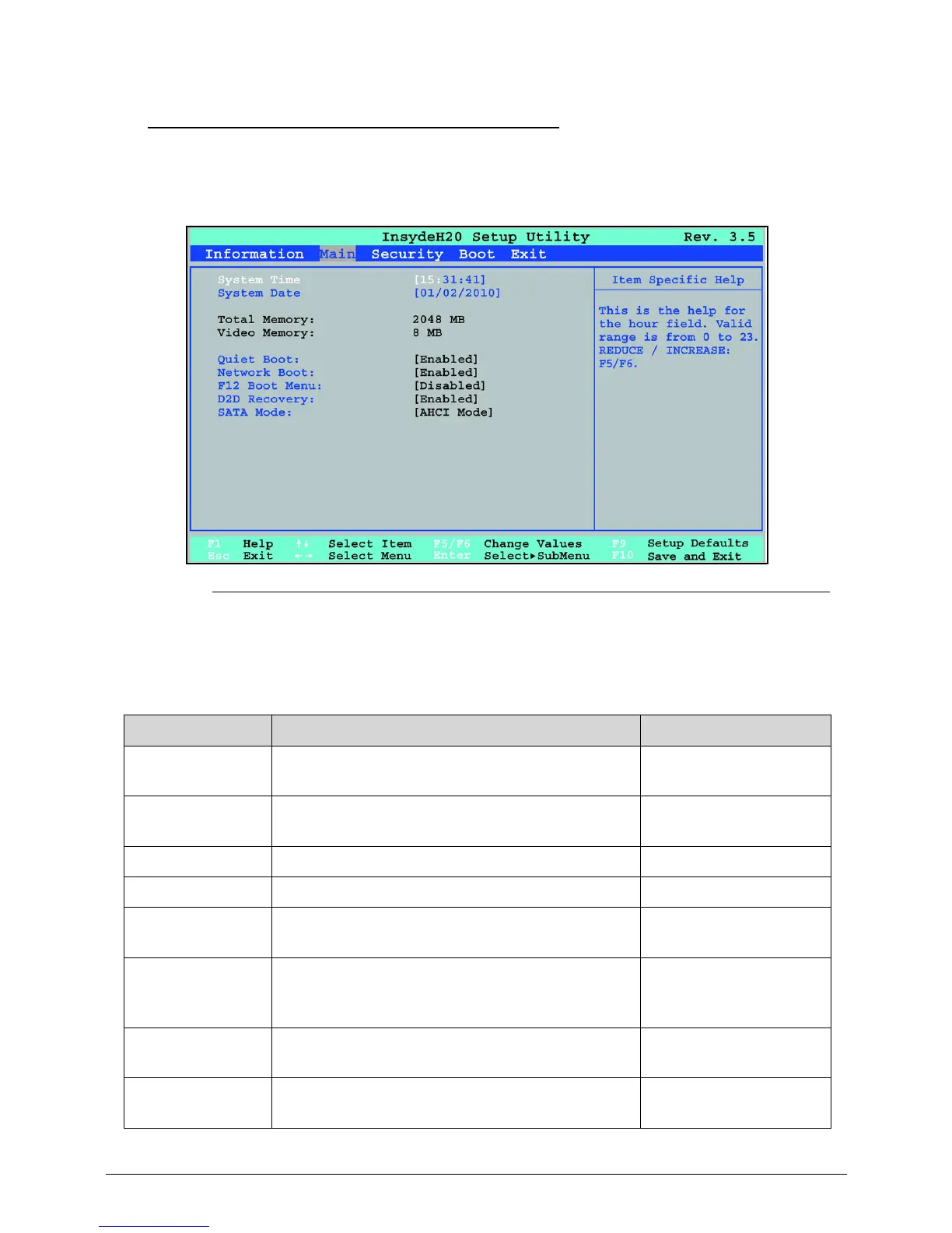 System Time BIOS system time in 24-hour format Format: HH:MM:SS