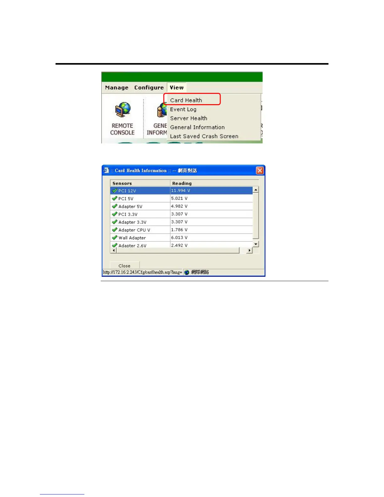 Left click the Card Health menu item to view the health information of the ARMC/2 card.