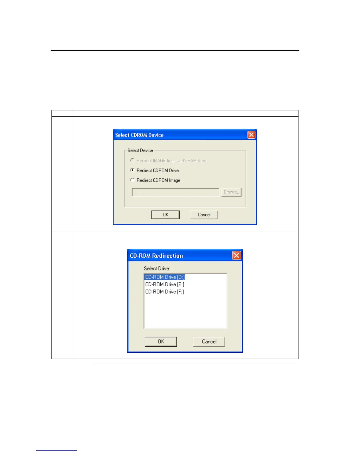 Once you open the CD-ROM Drive Redirection Dialog Box, follow the steps below: