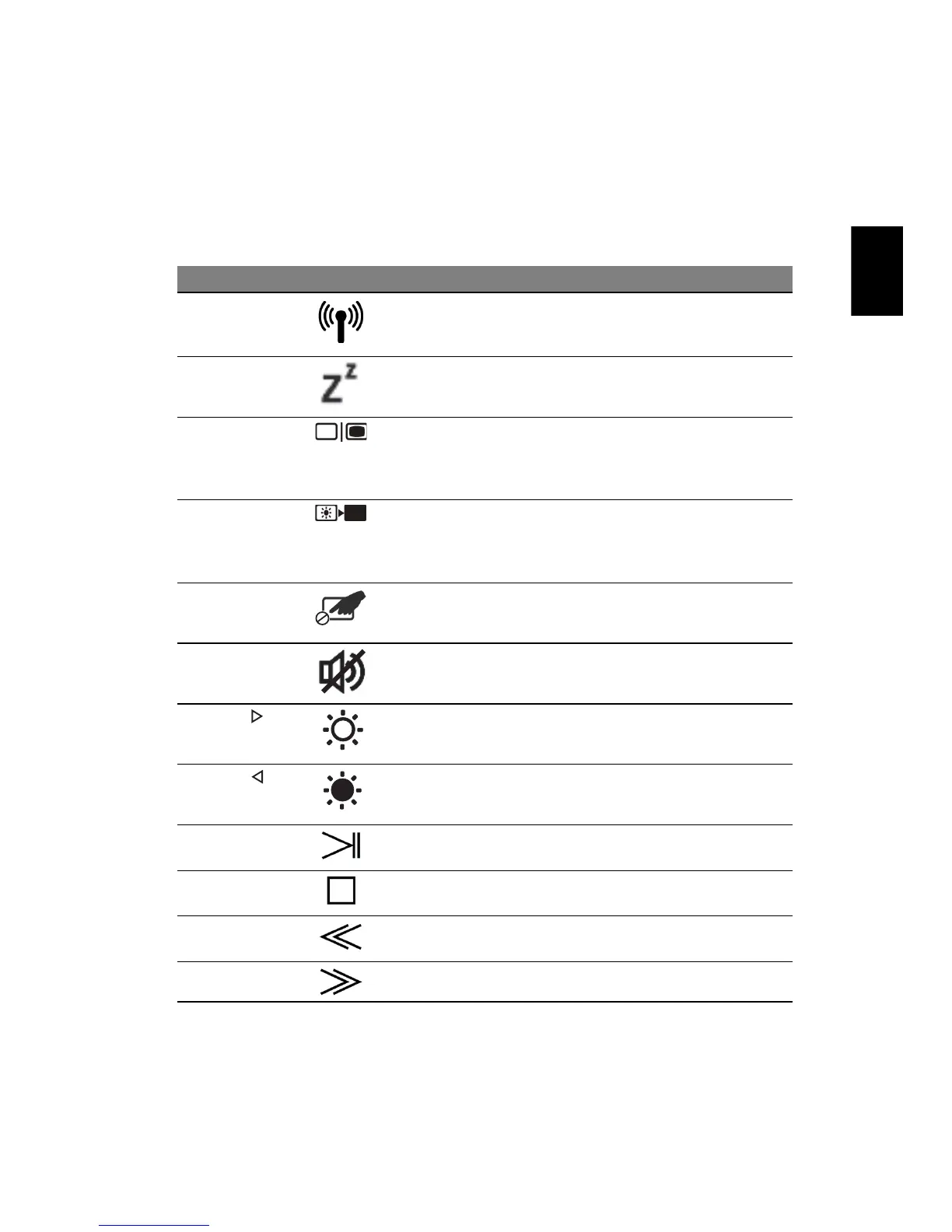 <Fn> + <F6> Tukšs ekrāns Enerģijas taupīšanas nolūkā izslēdz