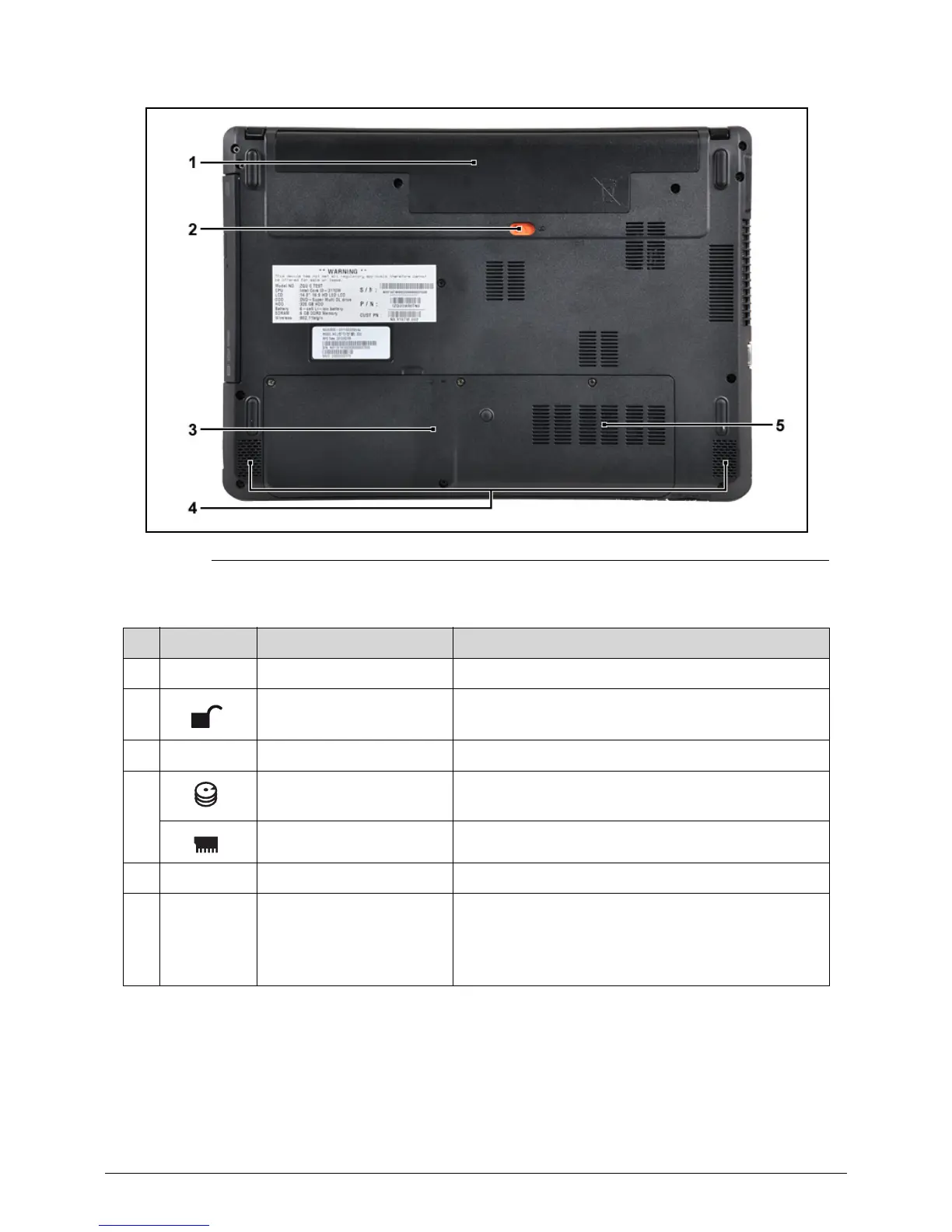 1 Battery bay Houses the computer's battery pack.