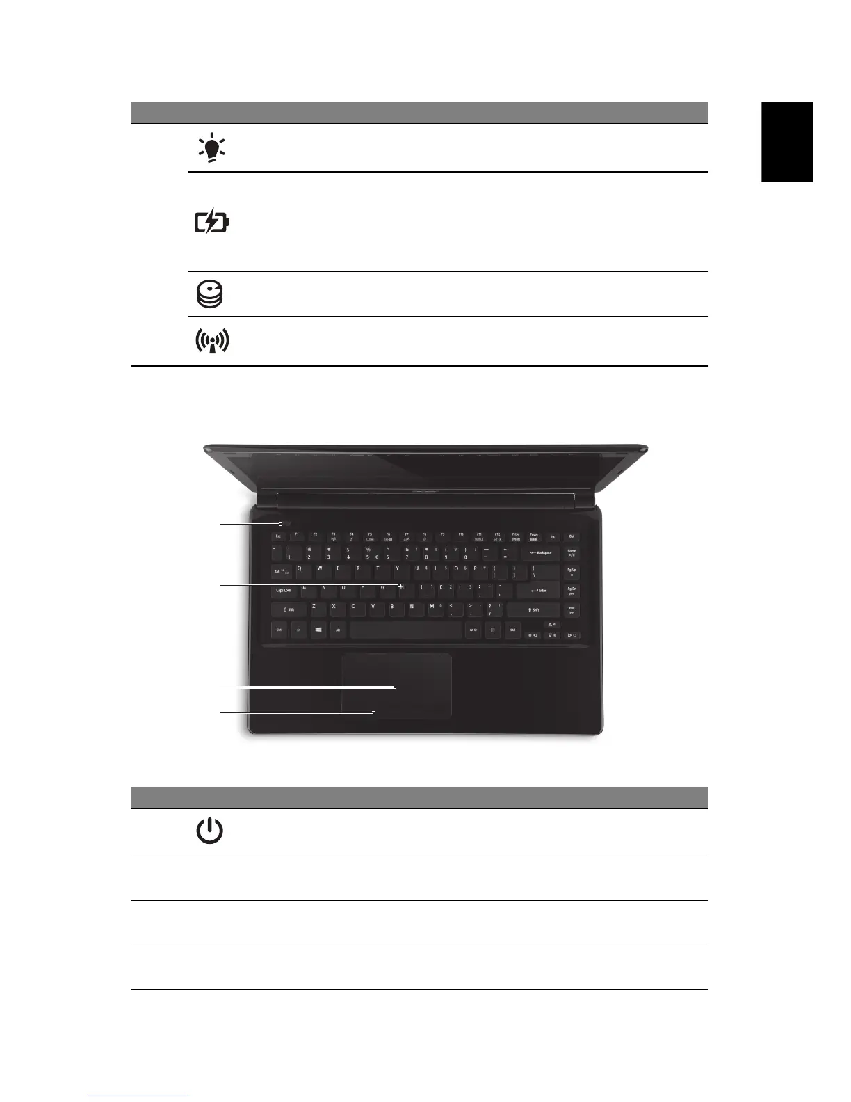 Power indicator Indicates the computer's power status.