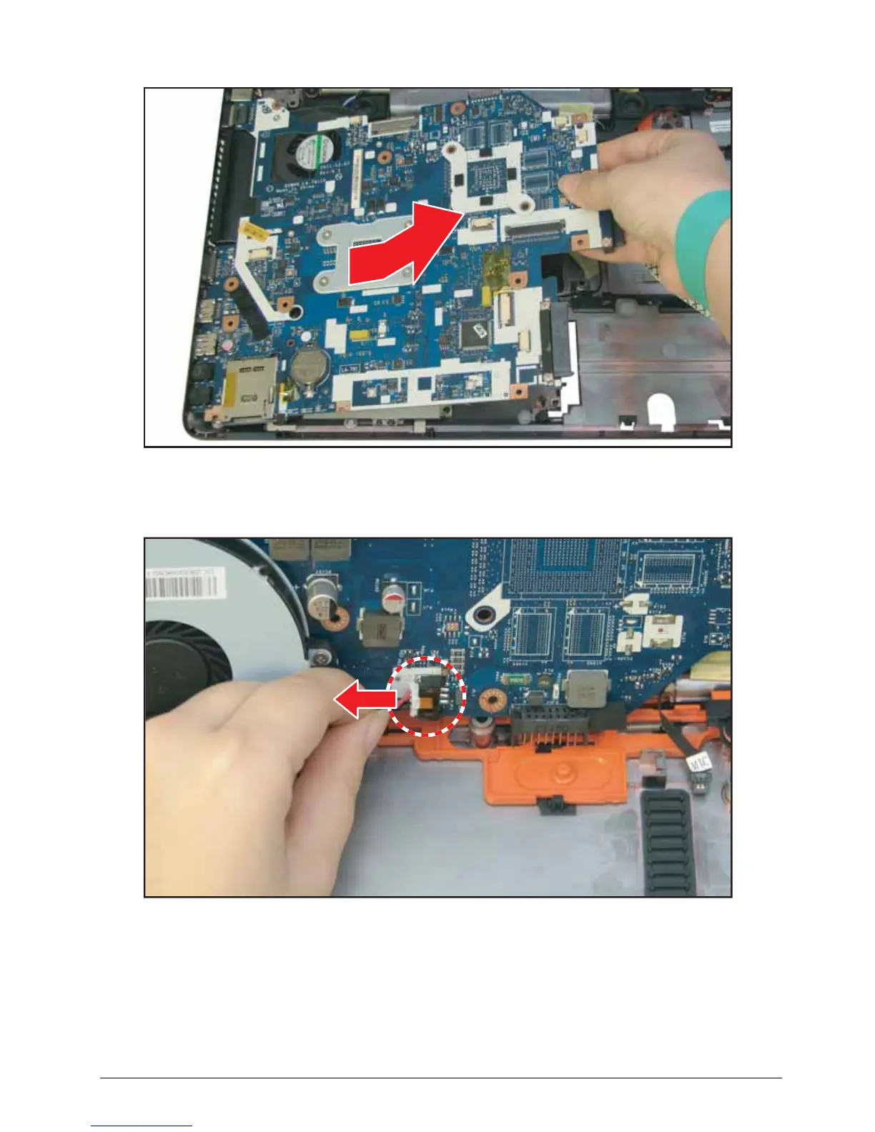 6. Pull the mainboard by the right side to release the connectors from the slots on the lower case.