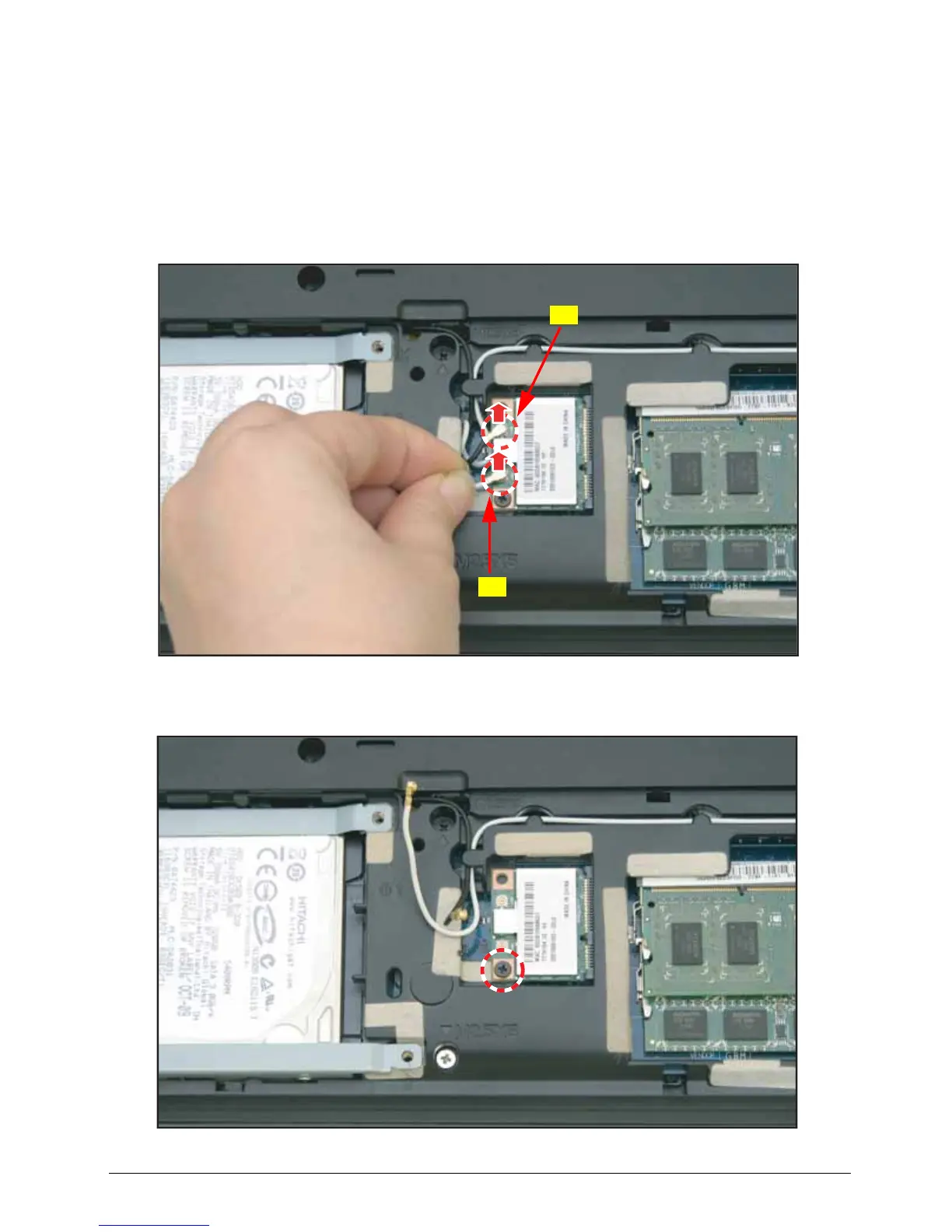 2. Disconnect the main (A, black) and auxiliary (B, white) antenna cables from the WLAN module