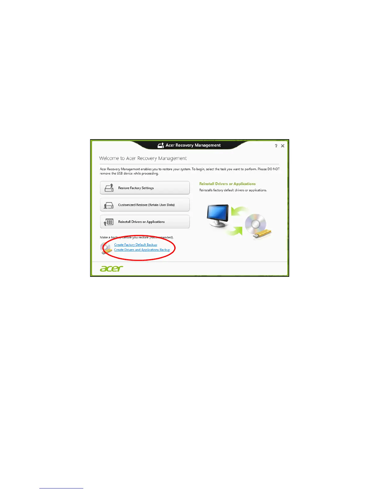 2. Click Create Factory Default Backup. The Recovery Drive window