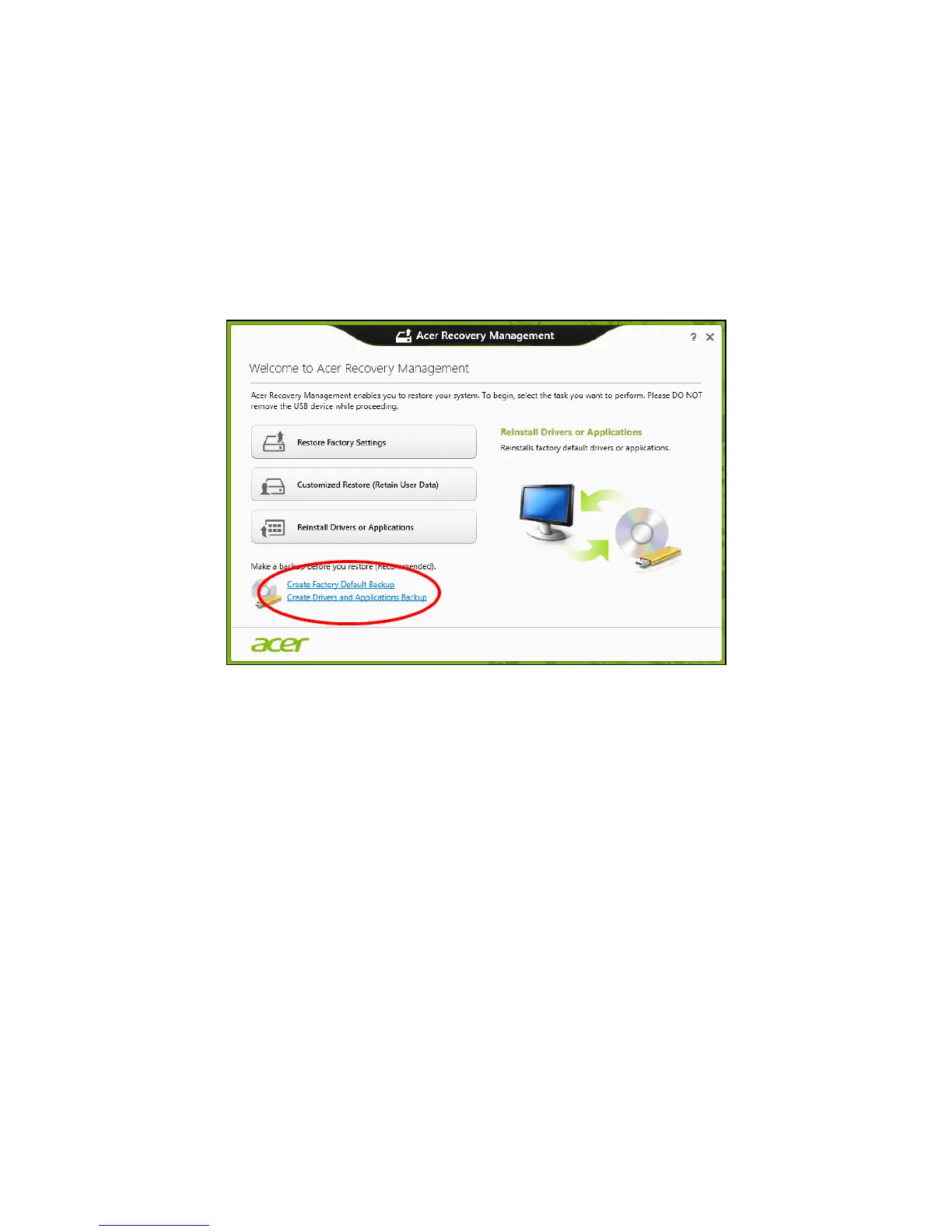 1. From Start, type 'Recovery' and then click Acer Recovery