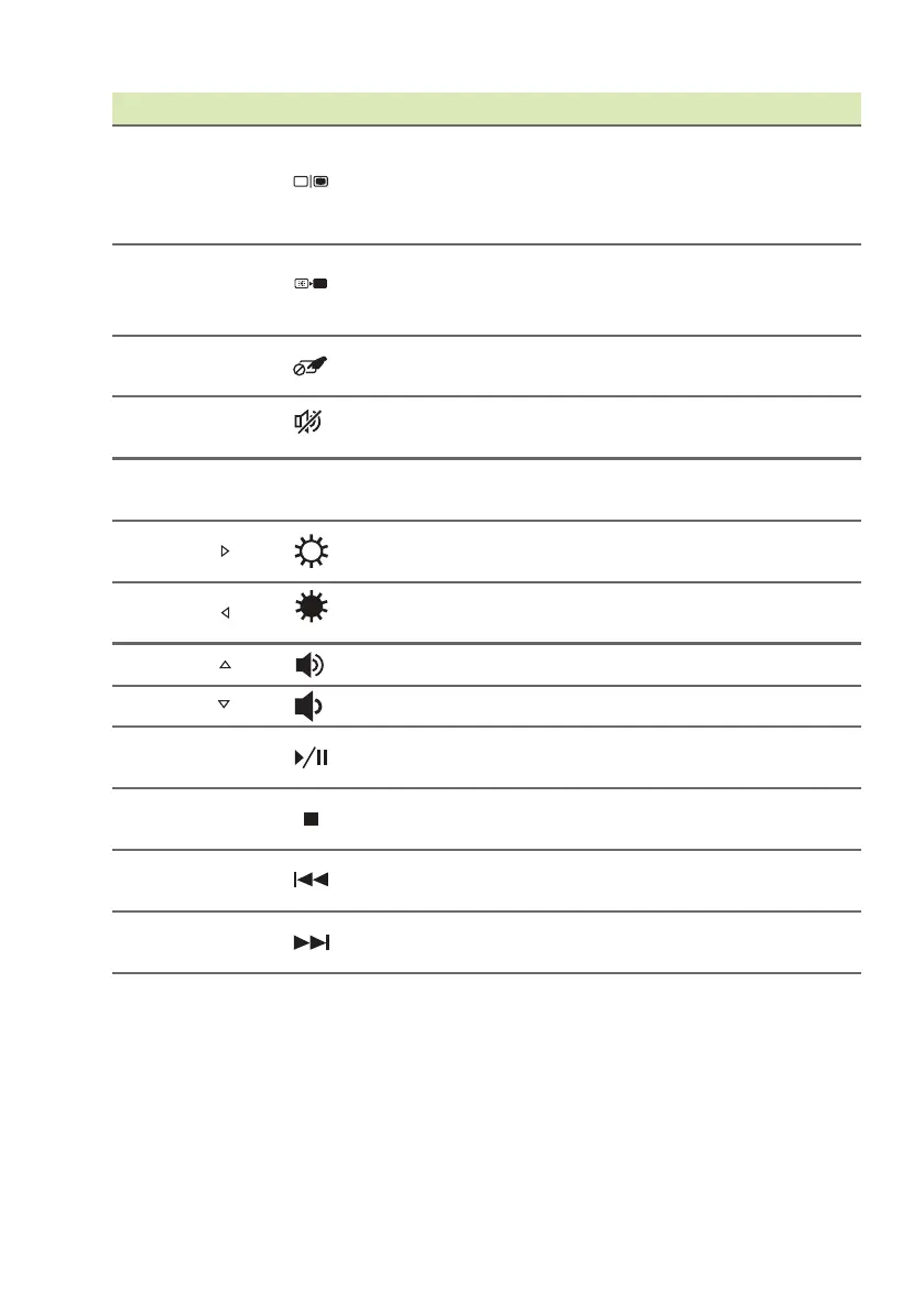 <Fn> + < > Volume down Decreases the sound volume.