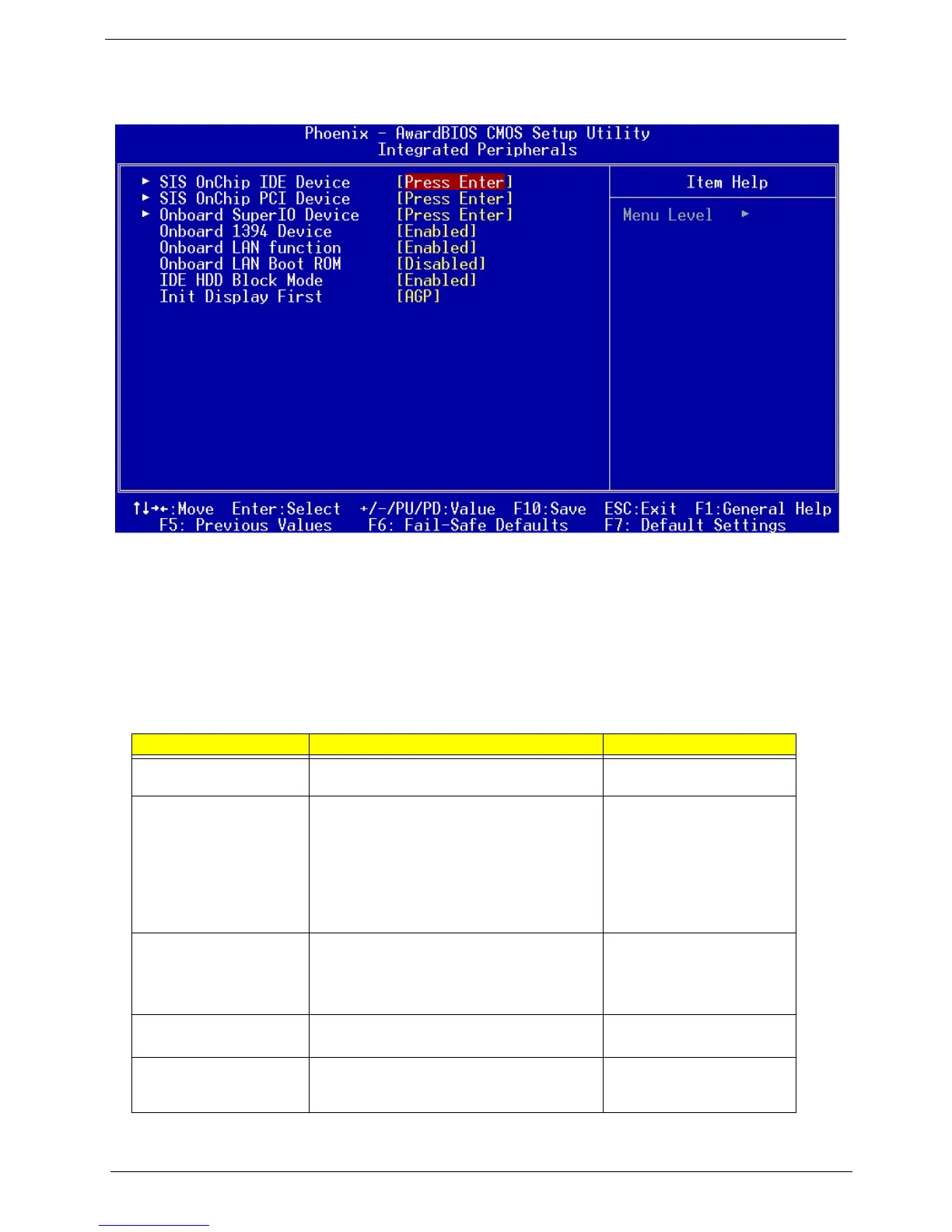 The following table describes each Integrated Peripherals parameters. Settings in boldface are the default