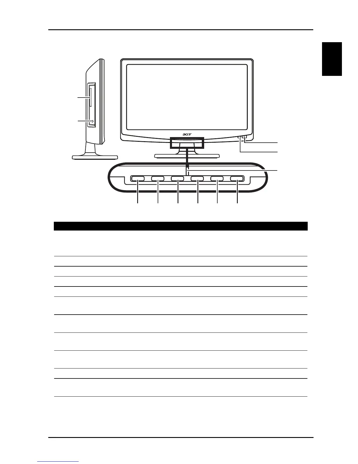 6 Volume down When the OSD is on, functions the same as the Left