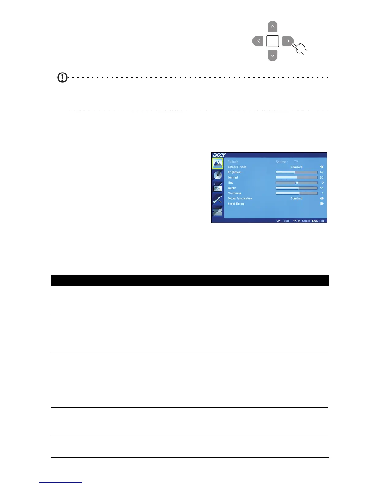 Note: The options available on the OSD may vary depending on the TV