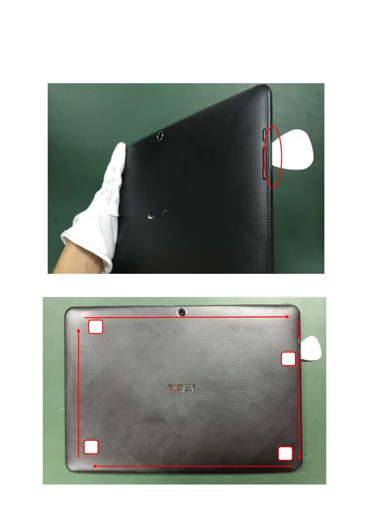 Pry into the gap from side key button location, separate the rear cover from tablet as the arrow shown.