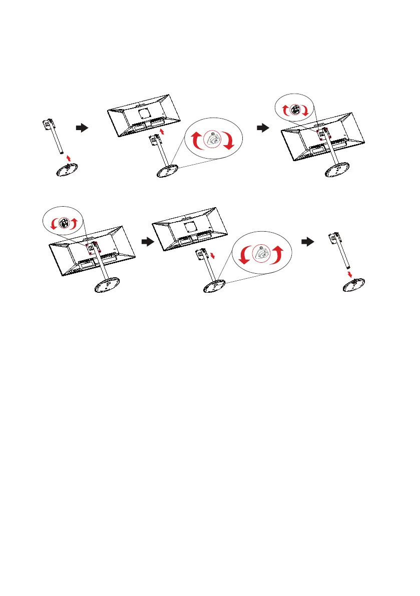 Installation: Align the base with the stand and push the base towards the top of the monitor, and