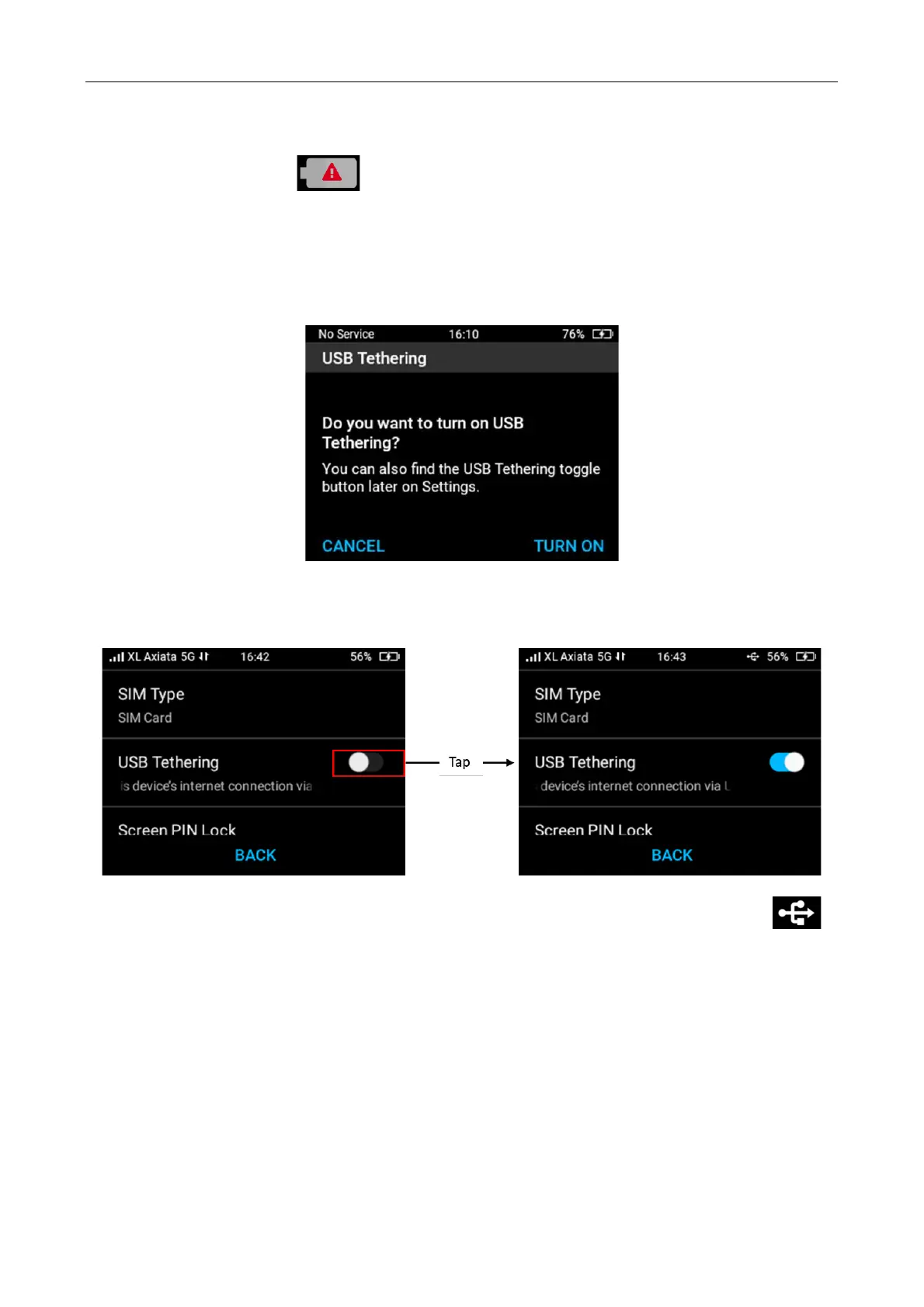 want to turn on USB tethering?”. Press “Turn ON” will enable USB tethering.