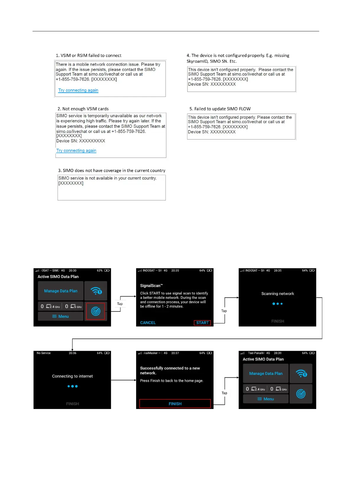 To use SignalScan™, tap icon SignalScan™ from SIMO home screen > tap Start to SignalScan™