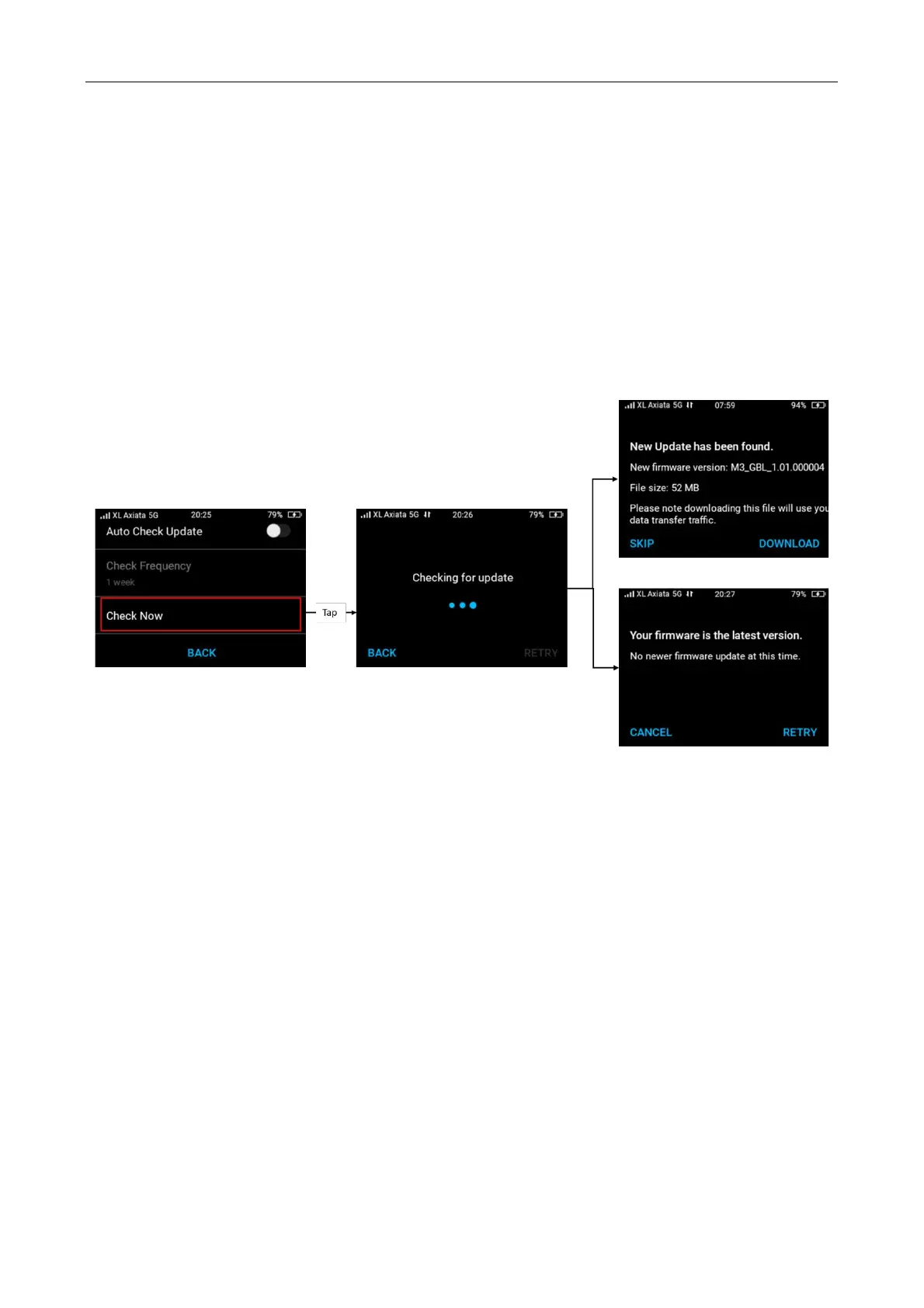 on this mode. By tapping Check Now from Firmware Update menu, the system will check the