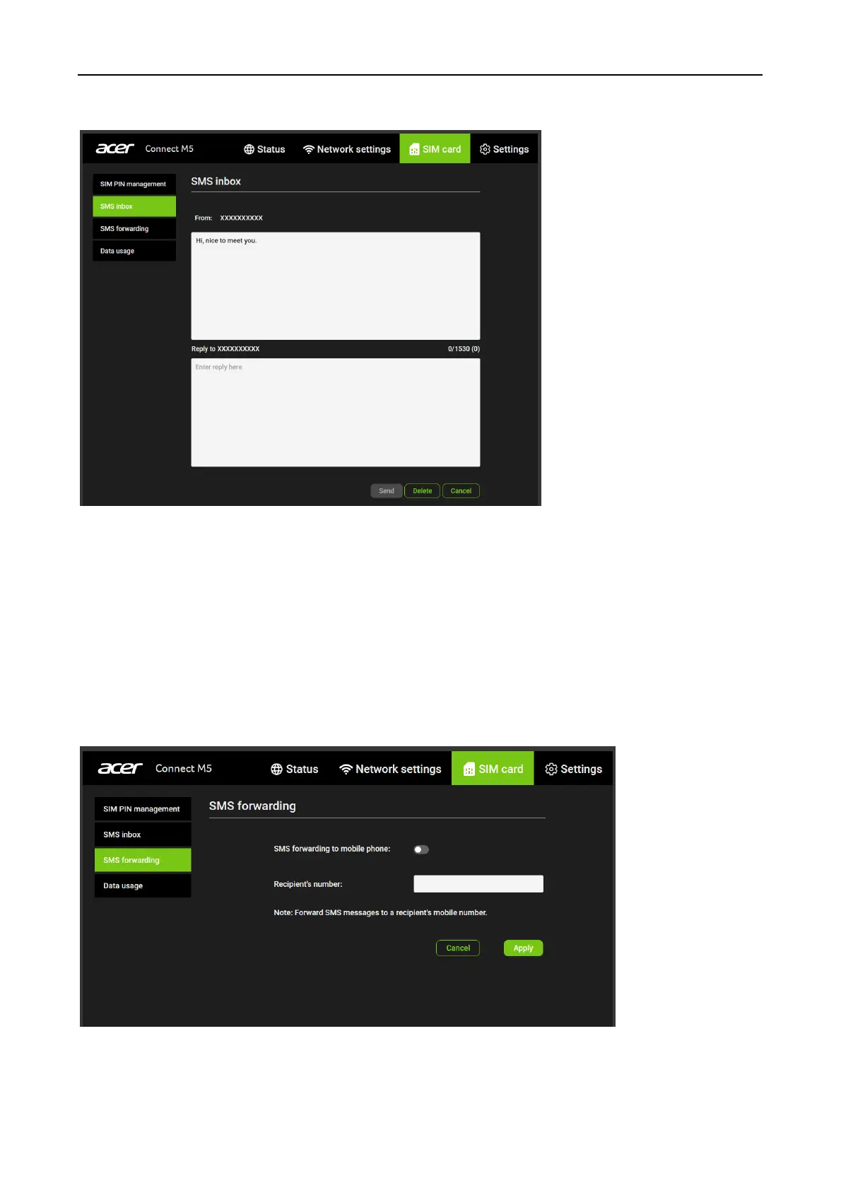 SMS forwarding allows you to forward SMS messages sent to your Acer Connect M5 to another
