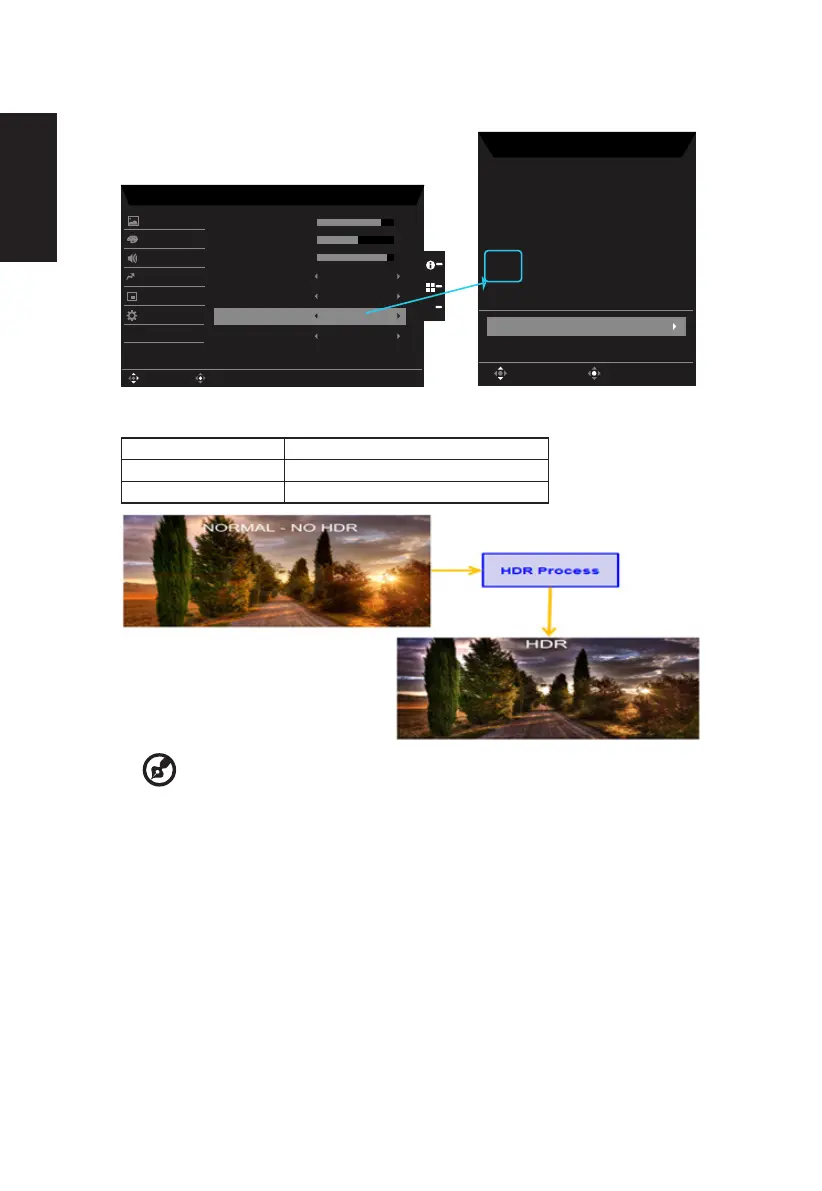2. HDR = (Auto), features: (ACM/Gamma/Contrast/Blue Light/Color Temp/Black