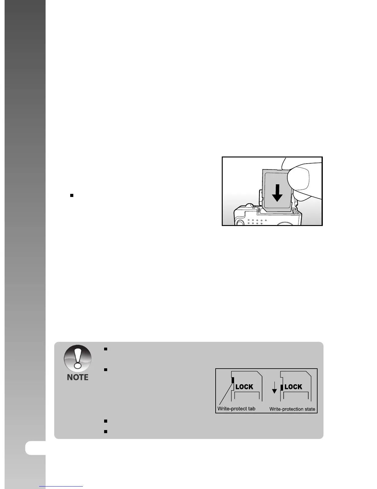 inserting the SD card, you cannot take photographs using the camera. Before