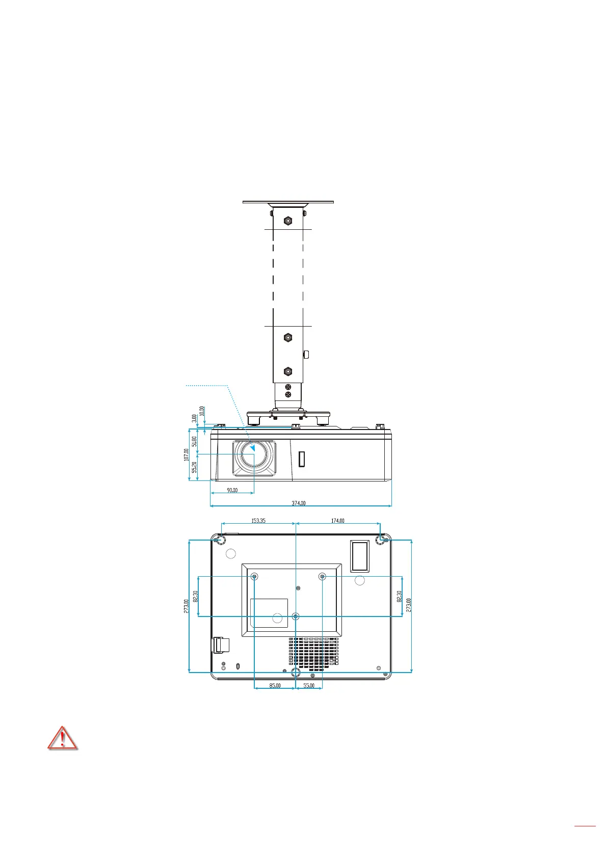 Be sure to keep at least 10 cm gap between the ceiling and the bottom of the projector.