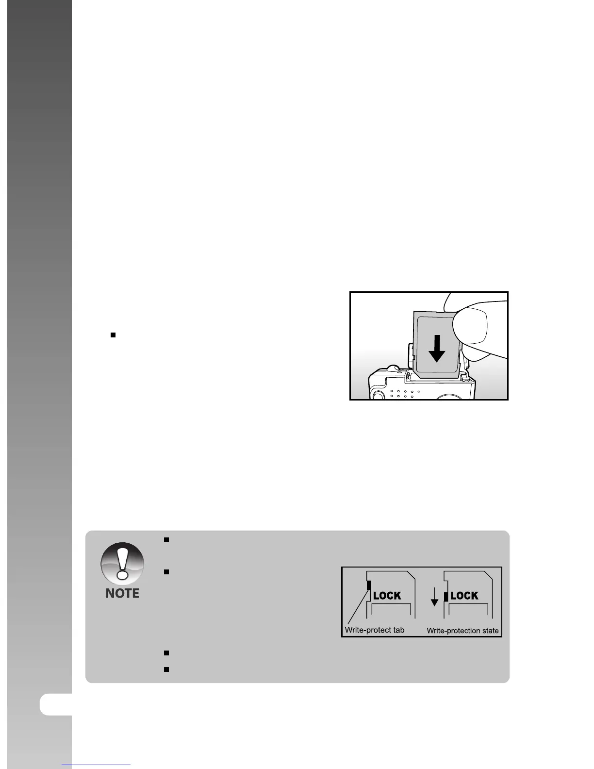 inserting the SD card, you cannot take photographs using the camera. Before