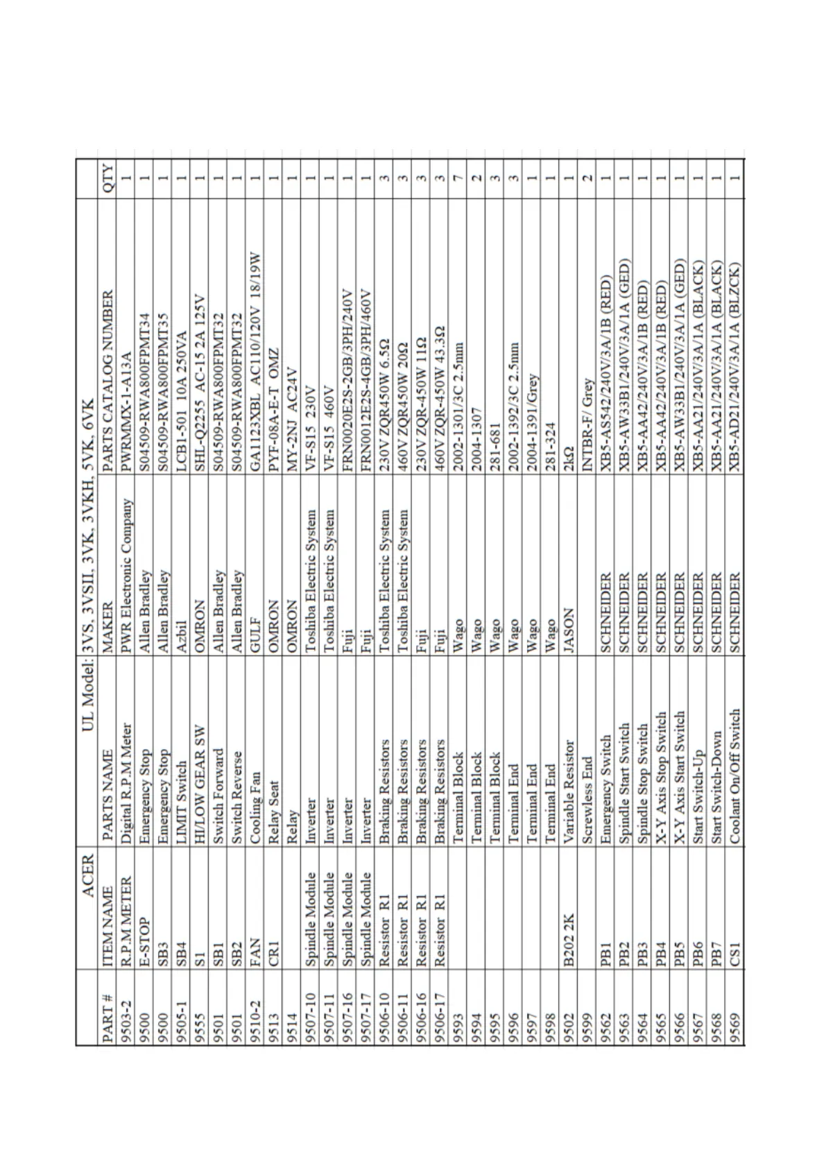 UL listing electrical part list for e-mill 3VS, 3VSII, 3VK, 3VKH, 5VK &
