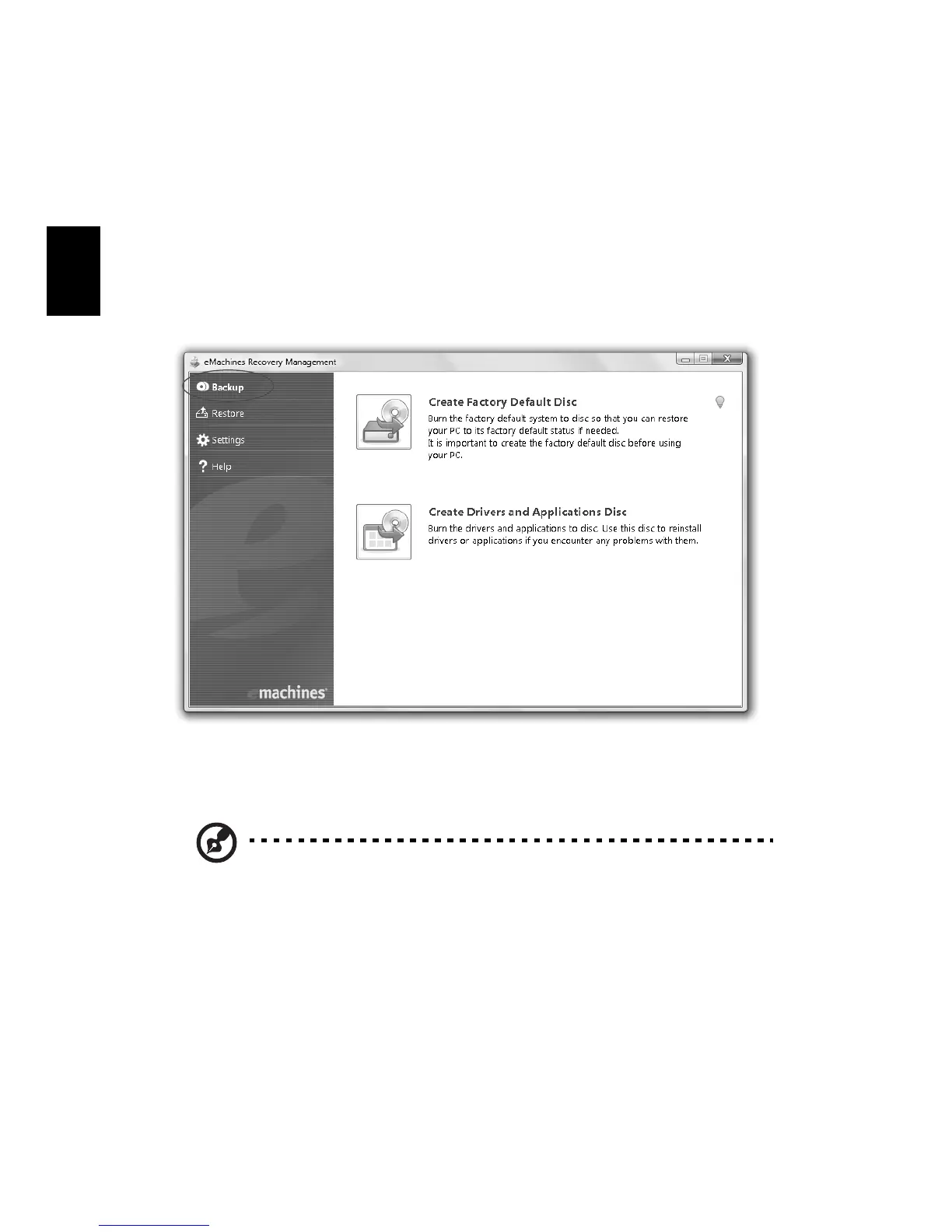 De pe pagina Copie de siguranţă a eMachines Recovery Management, puteţi