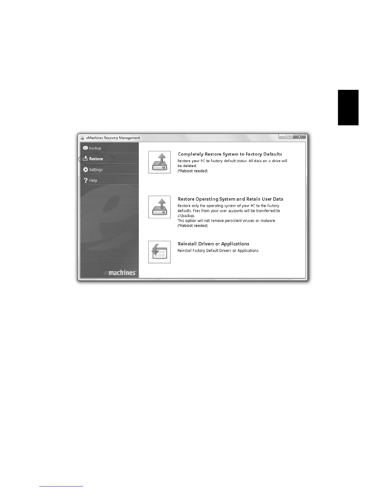1Faceţi clic pe Pornire, Toate programele, eMachines, eMachines Recovery