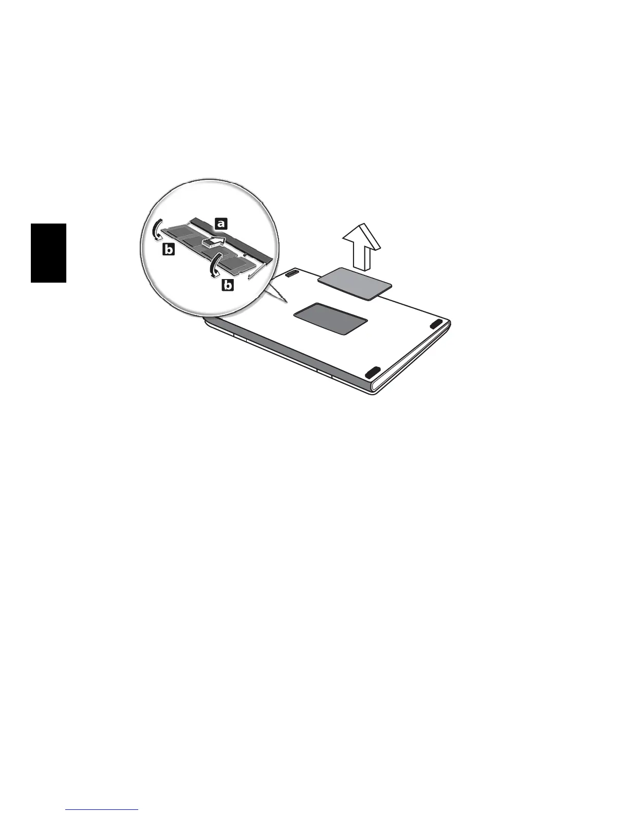 3 (a) Įdėkite atminties modulį įstrižai į plyšį, tuomet (b) švelniai jį paspauskite