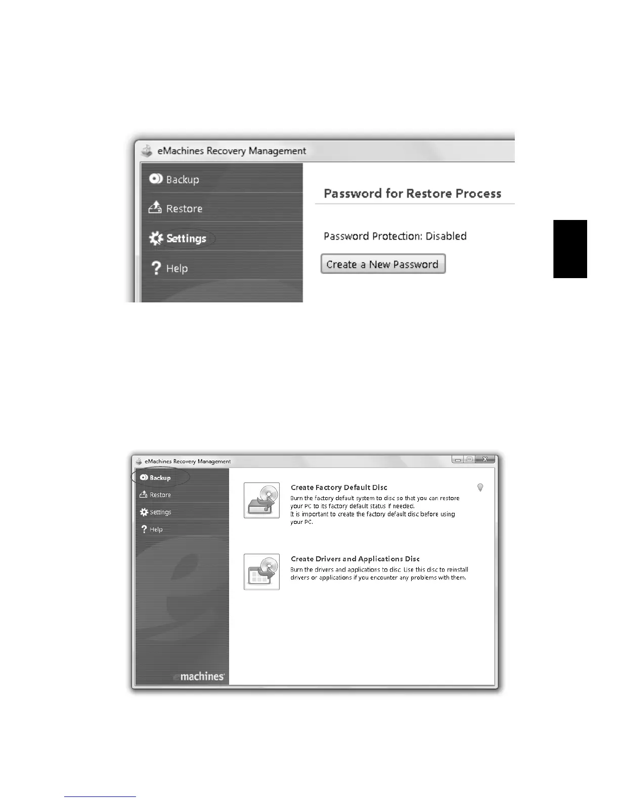 slaptažodį nustatyti galite paleidę „eMachines Recovery Management“ ir paspaudę