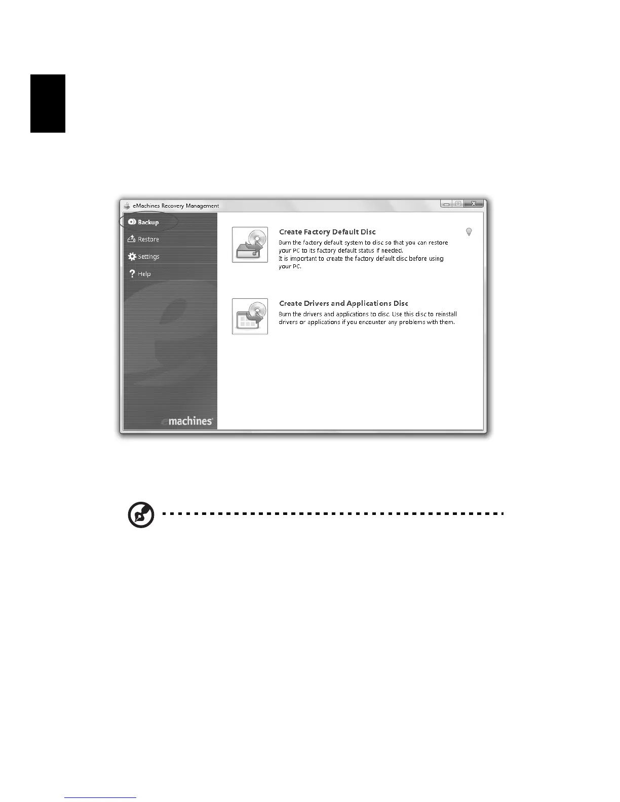 2 eMachines Recovery Management, Backup sayfasında açılır.