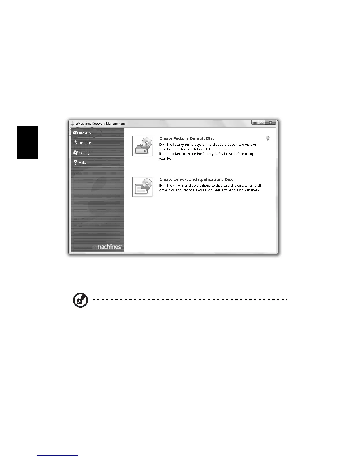 2 eMachines Recovery Management abre la página de copias de seguridad.