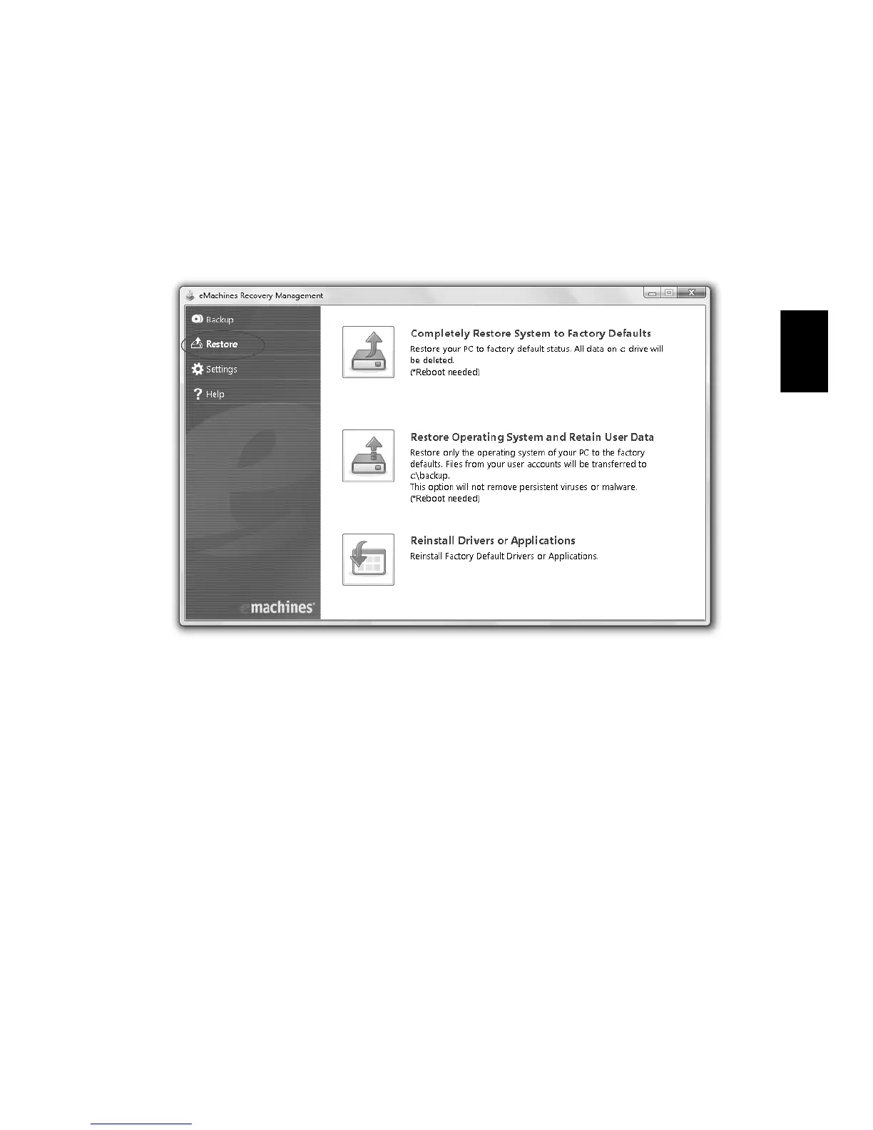 1 Klik op Start, Alle Programma’s, eMachines, eMachines Recovery