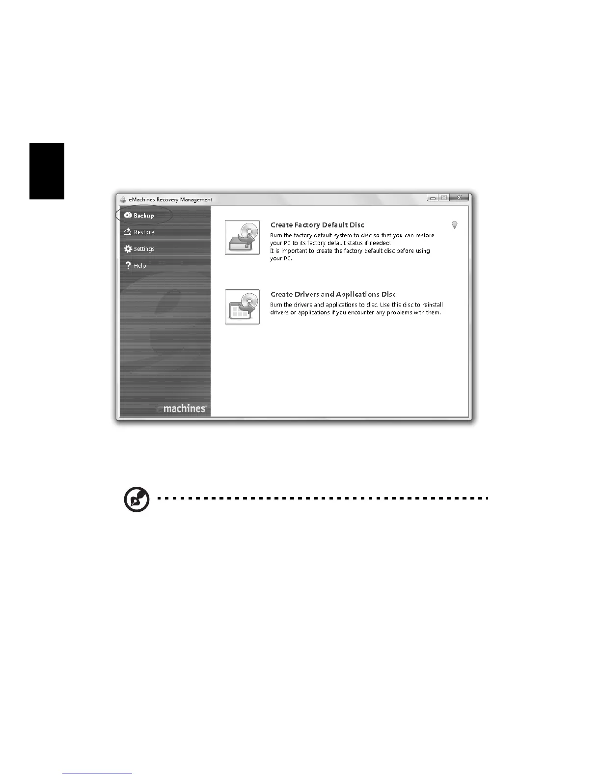 2 eMachines Recovery Management åpnes på siden Sikkerhetskopi.