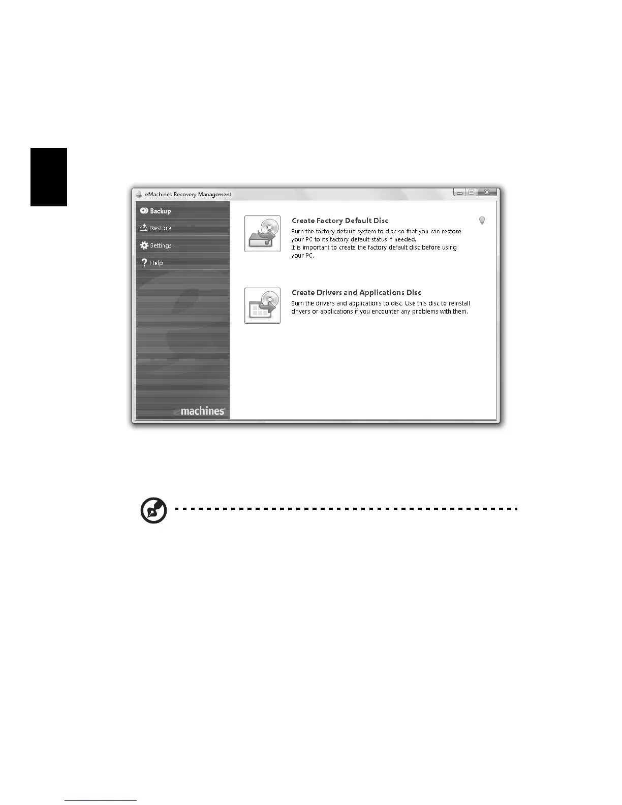 1 Välj Start, Alla program, eMachines, eMachines Recovery Management.