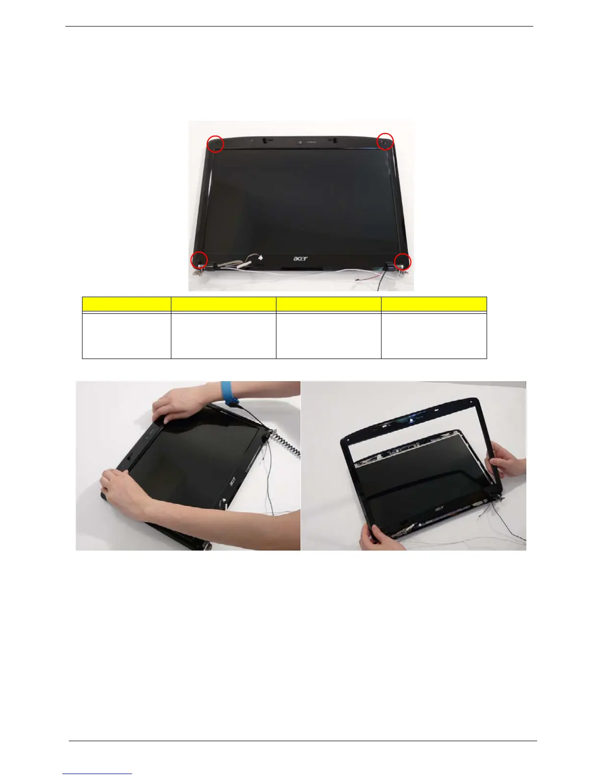 3. Remove the two upper and two lower bezel screw caps. Remove the four securing screws from the LCD