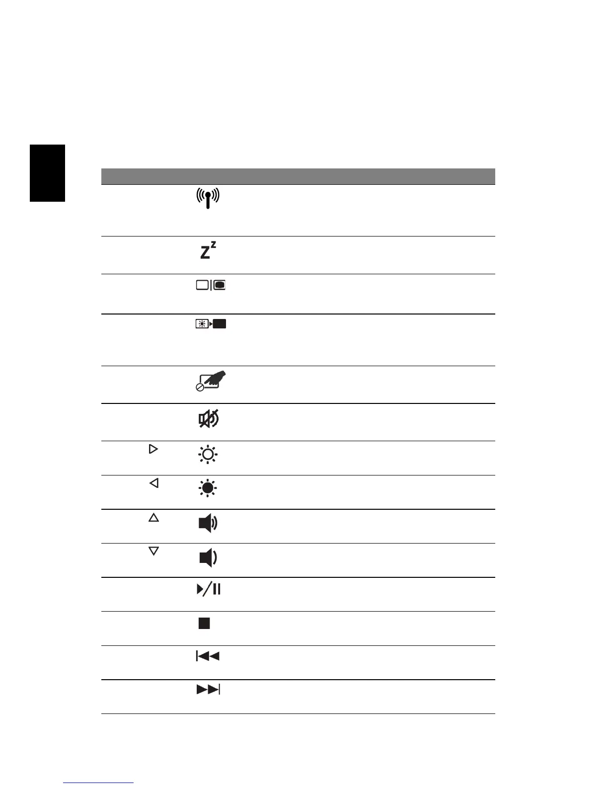 Hurtigtast Ikon Funksjon Beskrivelse