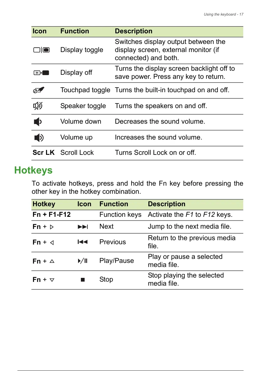 Fn + F1-F12 Function keys Activate the F1 to F12 keys.