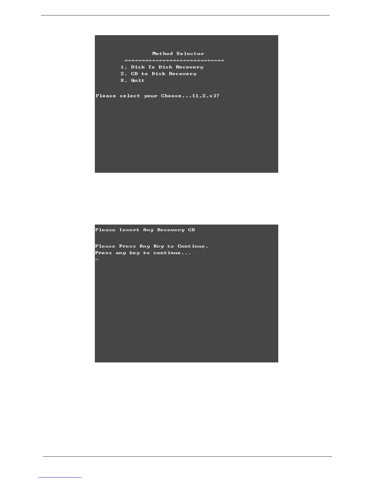 After you place the Recovery CD to the optical drive, you will see the display below.