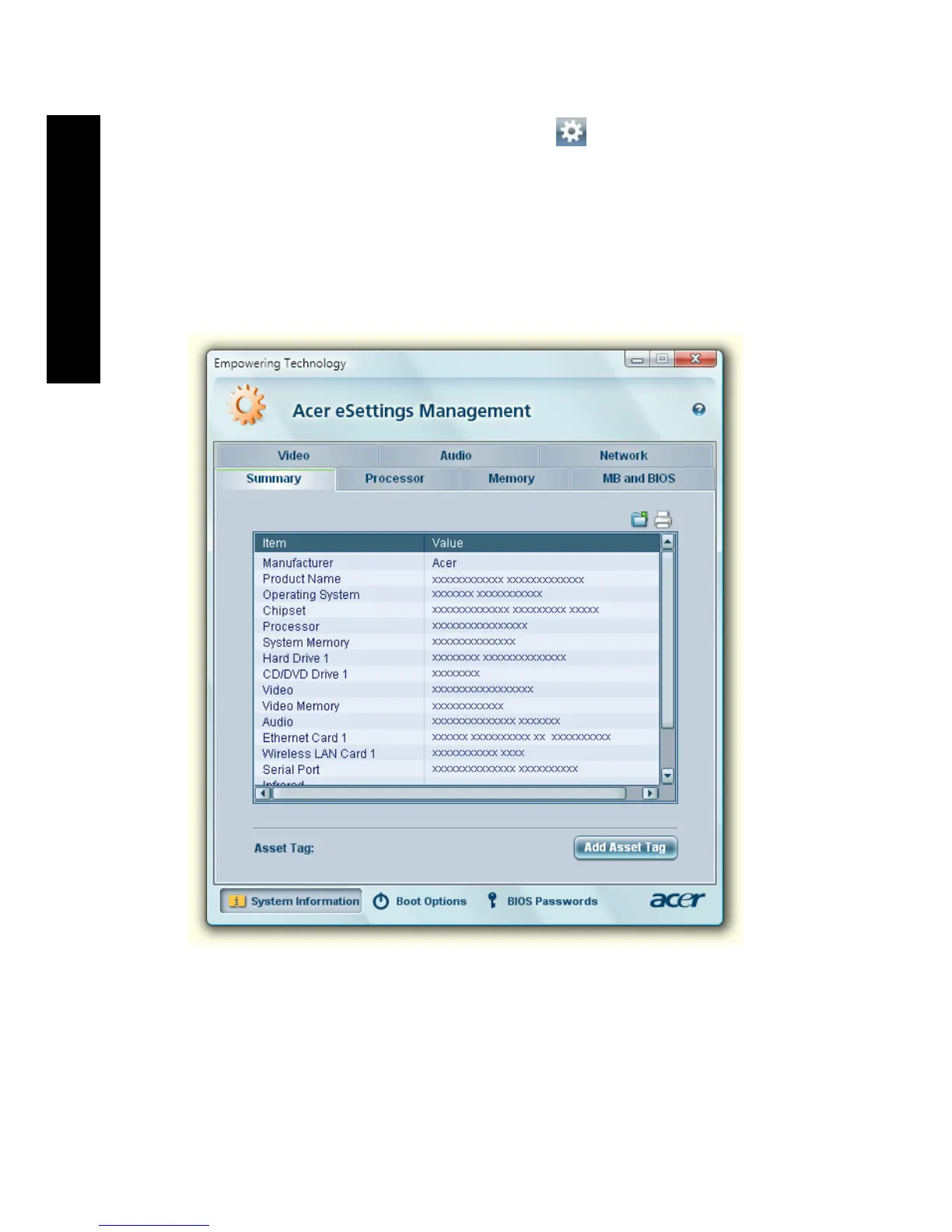 Acer eSettings Management allows you to inspect hardware specifications, set