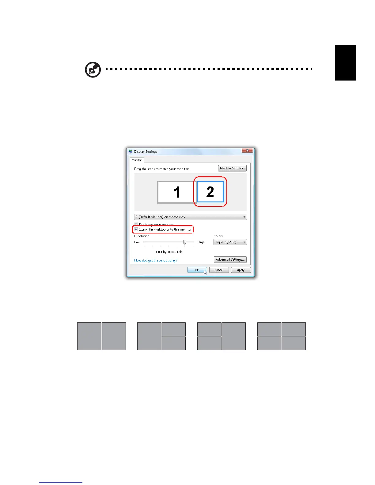 click the check box Extend the desktop onto this monitor. Finally, click Apply to