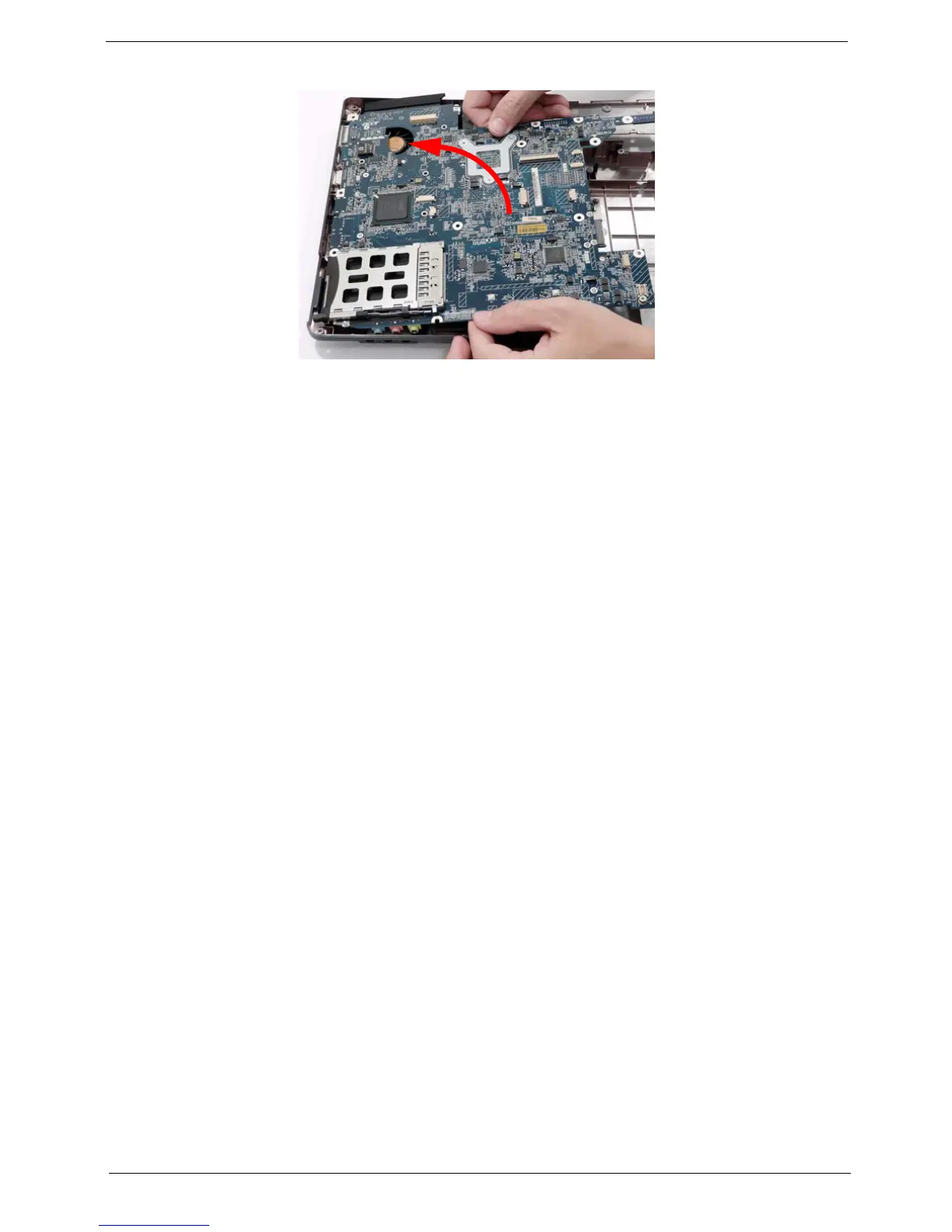 9. Grasp the mainboard by both sides and pivot upwards to remove.