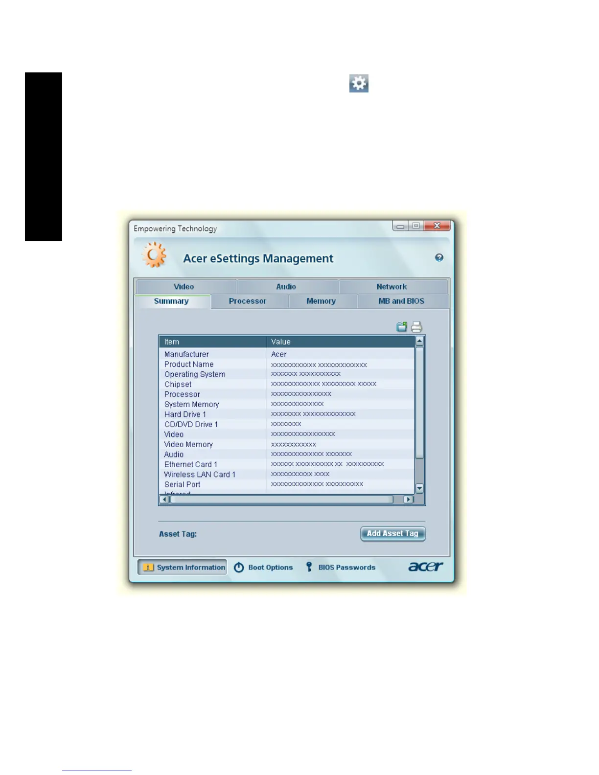 Acer eSettings Management allows you to inspect hardware specifications, set