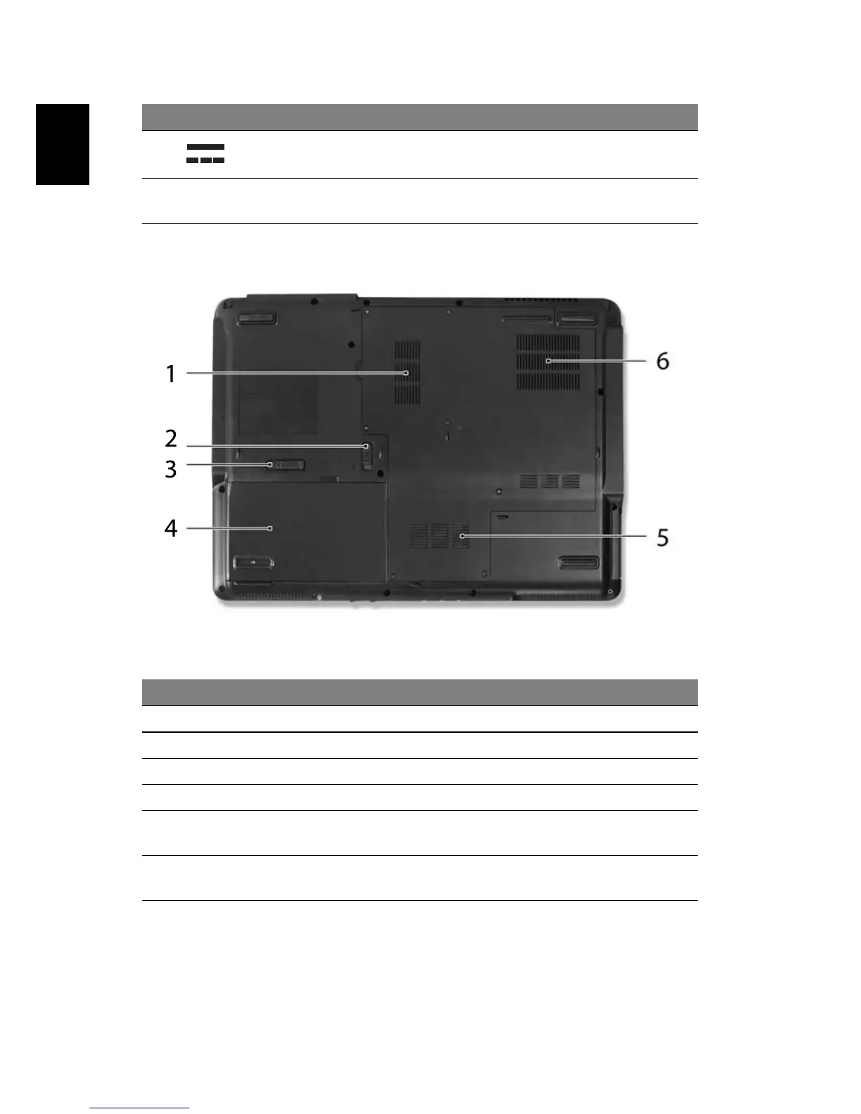 5 Hard disk bay Houses the computer’s hard disk (secured with