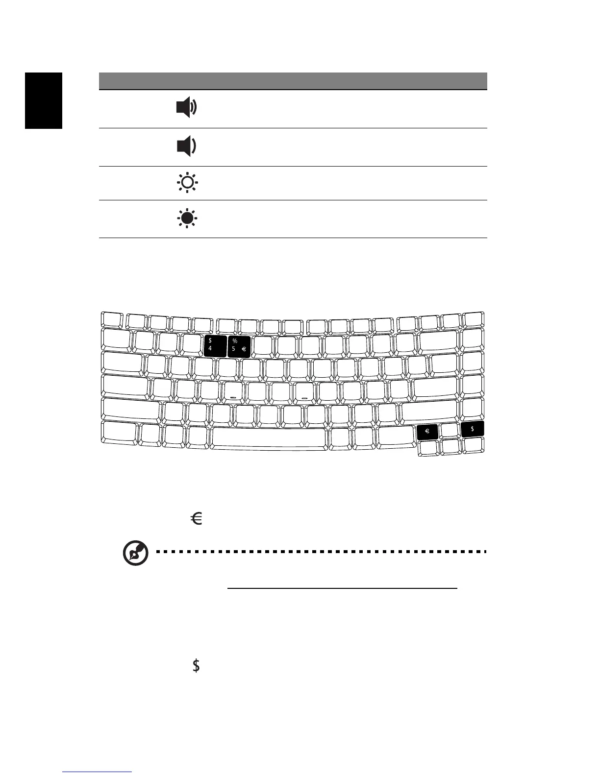 <Fn> + <↓> Volume down Decreases the sound volume.
