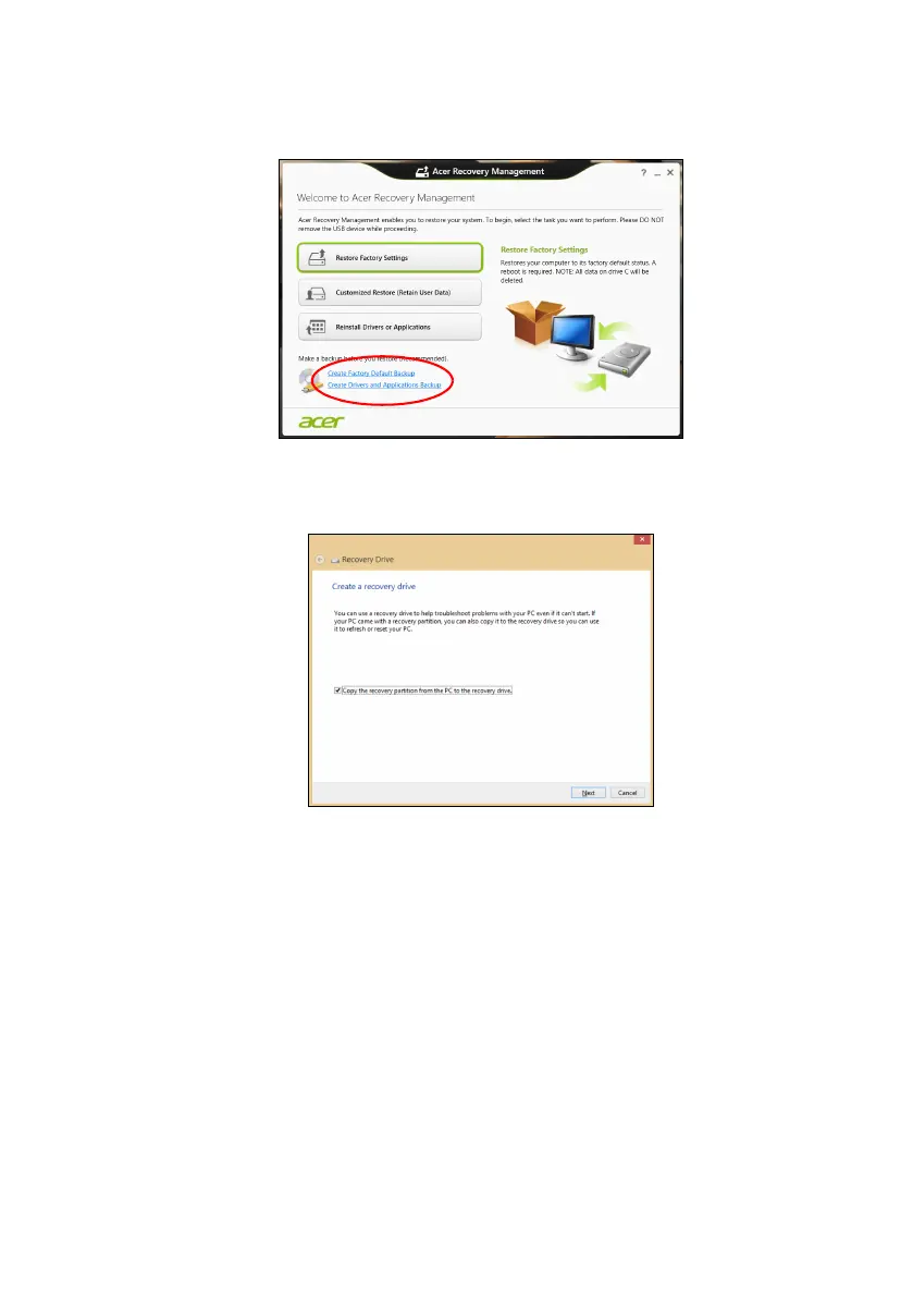 2. Click Create Factory Default Backup. The Recovery Drive window